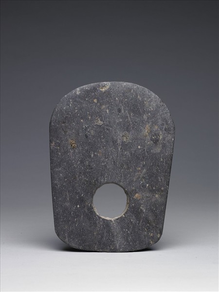 石質,帶有點狀赭斑與白絲狀斑。全器近於扇面,平背,兩角略圓,器兩側斜出,圓弧刃,刃為中鋒。