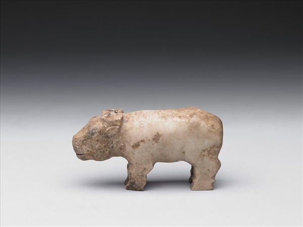 石牛立雕,赭色偏紅,並帶有白粉狀物。全器雕作牛形,四肢站姿,牛首刻畫出牛嘴、眼及彎曲的兩角。牛身無紋。與贈玉423成一對。