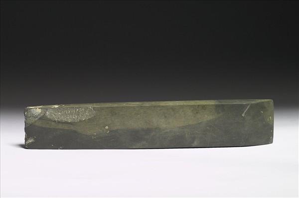 石質,表面平滑,有縱向的打磨痕。全器為長方形,一端有傷缺,平刃,刃作偏鋒。