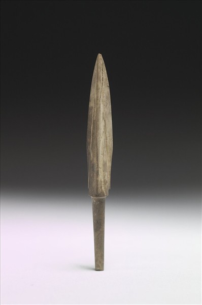 玉石,色澤淺褐,有黑斑點。全器為三菱錐形,鏃體有三翼(贈玉438-440)。有鋌,鏃體與鋌間區分清楚。