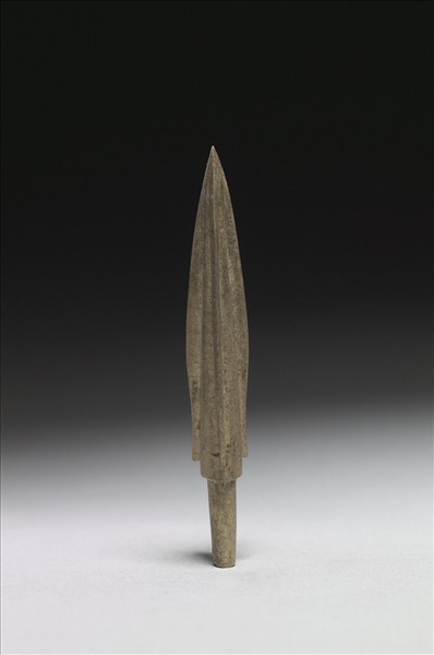 玉石質,色澤淺褐,有黑斑點。全器為三菱錐形,鏃體有三翼(贈玉438-440)。有鋌,鏃體與鋌間區分清楚。