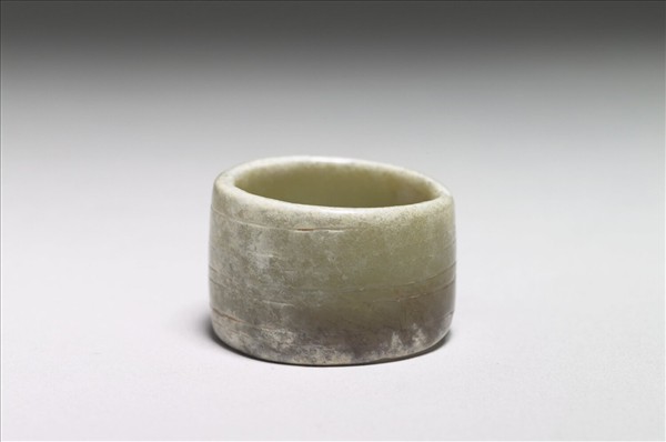 淡青泛黃綠色玉,局部沁為白色。琢一小巧的圓筒形器,器壁略鼓弧,上下器緣均微斂;以粗細不勻陰線刻繪三組各二條平行線。可能長期用繩索穿繫佩掛,故已有磨損凹縮的現象。