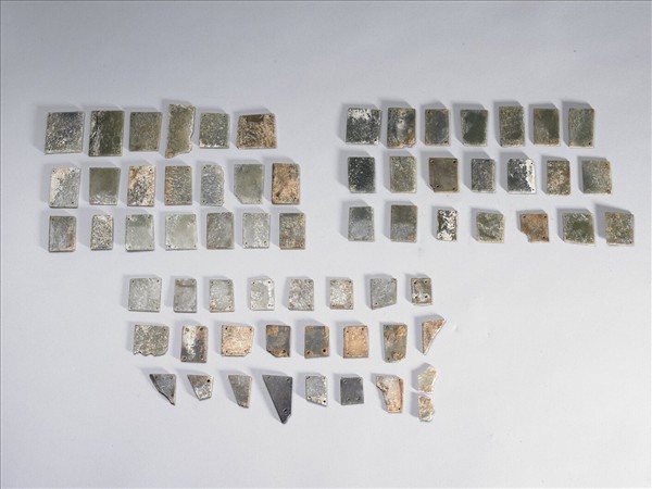 玉質,色澤各異,有灰、褐、白、青綠與淺赭。整組玉衣片六十五片,共有兩類:方形及三角形。每角均鑽有小孔。