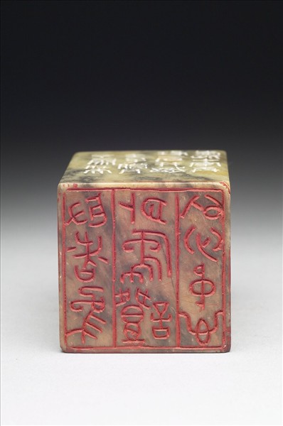 石章,印面方正,色乳白帶黃,間灰黑色斑紋。印面陰刻篆文「取諸象外象證以心中心」,印文三行十字,行間加欄線,章法古樸。邊款「缶廬詩草真跡中,錄張秀才題畫一首,儼然昌老口吻,豈其親所指授或代作,故書之稿中邪,余既摘刻吳句,又愛此十字,再瑑一石并識。壬子臘月,不為壯夫」。