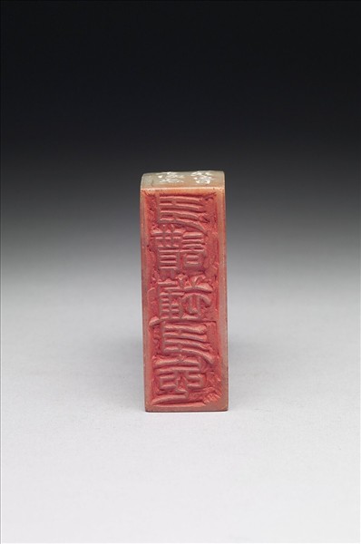 石章,印面長方,色乳灰間橙紅。印面陽刻五字篆文「多讀補多忘」,印文作細朱文多所留白,章法清雅。邊款「過目雖多只益慚,健忘偏足抵貪婪,好書畢竟還應讀,釋卷優游也不堪。陳協之有印云,多慚過目,釋卷便忘,老懷同感,嘗廣其意,刻多讀補多忘五字小章,頃又得一絕句,再刻此石。丁巳仲春漸者六十九歲」。印鈕作提籃把手狀。