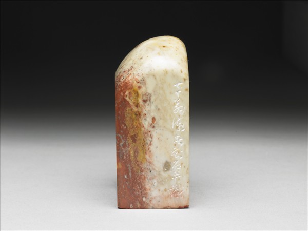 石章,印面正方,色灰白泛青,一角作深紅。印面陰刻八字篆文「不參悲喜不可榮辱」,邊款「錯翁詩云,不已妄念參悲喜,僕摘其四字,轉謂不以悲喜參意念,豈不超脫。不可榮辱,謝在杭語,不可辱易,不可榮難,語出五雜俎,乃重翻,已不得其幾卷幾葉矣。戊午耑陽七十翁漸者刻石并識」。