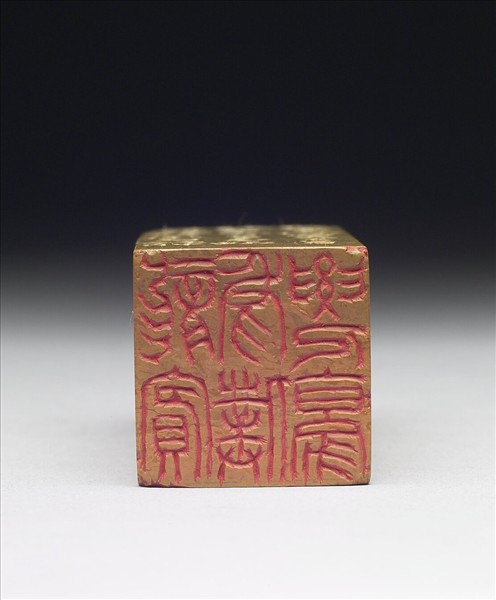石章,印面正方,色乳灰泛黃。印面陰刻七字篆文「虎賓龍僕要人豪」,邊款「硃泥鐵畫盡操刀,紙陣陶泓夜遣毫,鳥篆蟲書摩古璽,龍賓虎僕仗人豪,平生最樂千場醉,抵死難逃二鬢毛,撫琖悠悠念天地,迴看下首玩高尻。刀筆賣錢,得醉賦此。漸翁,庚申冬月」。