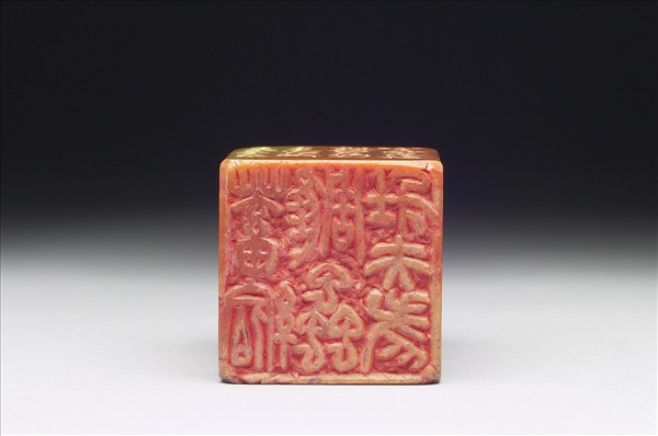 石章,印面方正,色青黃間橙紅。印面陽刻七字篆文「蓄縮雕蟲壯夫老」,邊款「花枝婭奼冶北城,來及平臺啜茗時,縮雕蟲壯夫老,燃脂甘讀女郎詞。沈乙盦題徐積餘定林訪碑圖詩也,其處有陸務觀題名,摘刻七字,所謂斷章取義云尔。務觀入蜀抵鎮江曾記蔡守點茶事,沈詩次句殆用其意。第二甲子秋月,漸翁并識」。