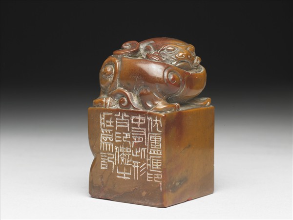 石章,印面正方,棕色間有暗紅色紋。印面陽刻回字形簡化獸紋,邊款「伏廬藏印中有此形肖印,儗之。壯為記」。印鈕立雕一螭,身體蜷曲做回首貌。