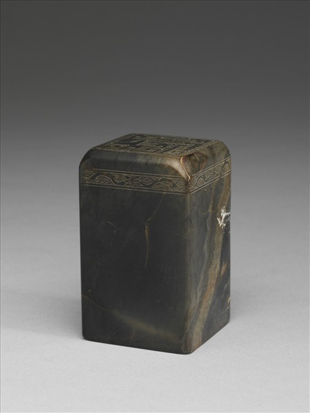 印材質硬,色黑,間帶灰白絲入其中,印面方正,「滌生」為寬邊細字朱文,字體小篆,以浙派切刀的刀法刻成,無款,不知何人所刻。印石頂面刻螭龍水波紋,三螭龍首分居中央與兩上側,身形作回紋,側面四面上緣環繞帶狀花卉水波紋。「滌生」,為清代名臣曾國藩用印,與另一方「曾國藩印」楚石印(贈玉499)為對印。