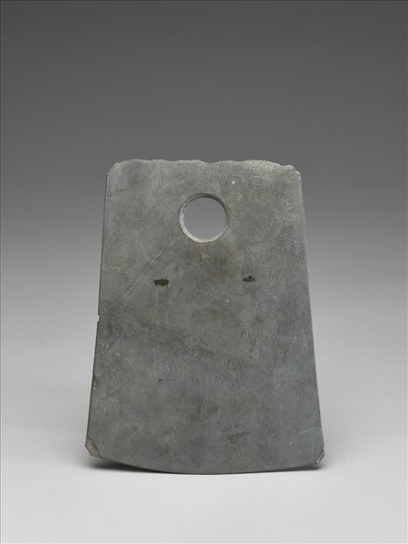 灰色較深,表面風化輕微。稍不對稱梯形,中型,器體扁平而薄,表面拋磨平整;平頂,頂緣不整齊,仍保留製作時的崩傷;器兩側斜出略撇;弧刃,無刃線,刃緣無傷,無使用痕跡,屬不開刃;一孔略大,兩面對鑽,孔壁旋紋清楚,中間一交會凸稜。
