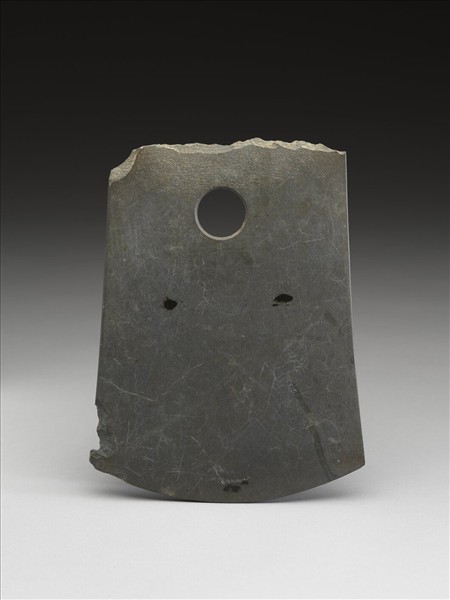 細粒灰色,表面輕微風化。對稱梯形,中型,器體扁薄,表面拋磨平整;頂平而不整齊,頂緣保留製作時的崩傷;器兩側撇出,一側的下端有二處崩傷;圓弧刃,無刃線,不開刃,刃緣無使用傷痕;一孔略大,兩面對鑽,孔壁旋紋清楚,中間一交會凸稜。