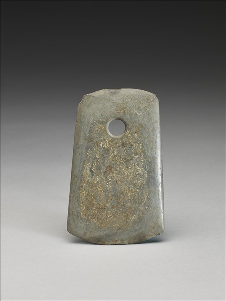 細粒,一面有較明顯的層理,雜細粒斑灰綠色,一面風化稍重。稍不對稱梯形,小型,器體中厚實,表面拋磨光滑;略歪斜弧頂,頂緣磨飾但不平整,尚留一點崩傷;器兩側斜出;弧刃,無刃線,刃稍厚鈍,刃緣有多處崩傷,屬使用傷;一孔略小,兩面對鑽,孔壁旋紋細然尚稱清楚。