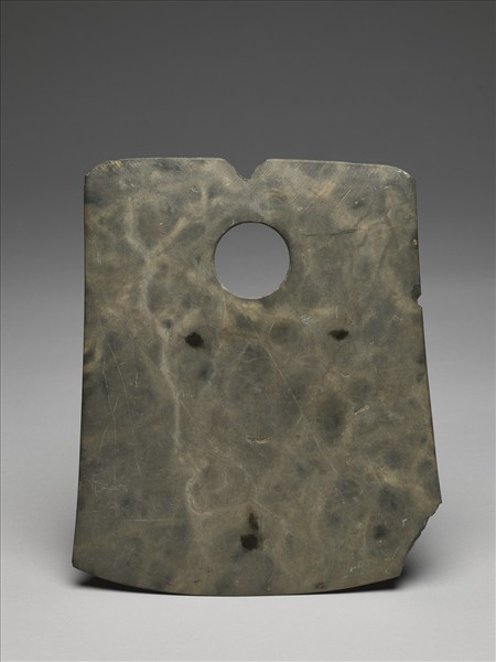 白色絲網紋灰色。對稱梯形,中型,器體扁薄,表面拋磨平整;平頂略斜,頂緣磨飾過,中間有一處較大的崩傷;器兩側微撇出;弧刃,中鋒(雙面刃),無刃線,刃緣尚稱銳利,刃一端角大塊傷缺,刃緣無傷痕;一孔甚大,近於單面鑽,孔壁旋紋較不整齊。
