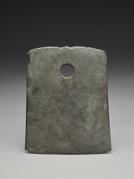 灰色,白絲網紋較模糊。對稱梯形,中型,器體扁薄,表面拋磨平整;平頂略弧,頂緣磨飾過但不平整;器兩側微斜下;平刃略弧,中鋒(雙面刃),無刃線,刃緣稍鈍厚,無大崩傷;一孔,兩面對鑽,孔壁旋紋細而清楚,中間有一交會凸稜。