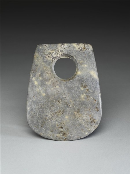 暗紫紅色與淡黃色膠結。近於扇面形,中型,器體中厚實,表面拋磨光滑;平頂,頂緣磨飾整齊;器兩側斜出;圓弧刃,中鋒(雙面刃),無刃線,刃緣厚鈍,多處小傷,非使用傷;一孔甚大,兩面對鑽,孔壁旋紋清楚,中間有一交會凸稜。