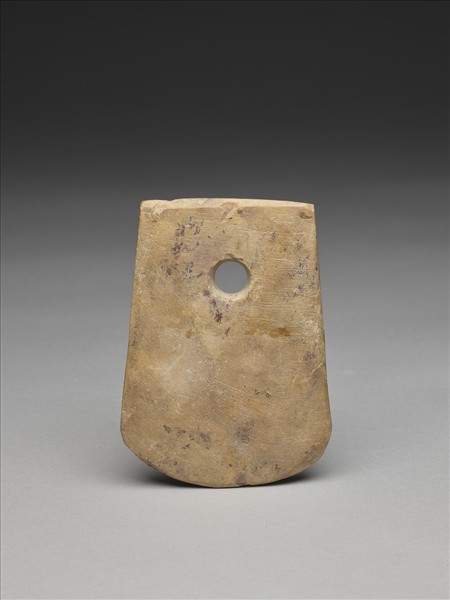 暗紫紅色與淡黃色膠結。對稱梯形,小型,器體略厚,表面拋磨平整;平頂,頂緣磨飾整齊;器兩側斜出;圓弧刃,中鋒(雙面刃),無刃線,刃緣厚鈍而磨飾平整,不開刃,有幾處小傷,非使用傷;一孔略小,兩面對鑽,孔壁旋紋較模糊,中間有一交會凸脊。