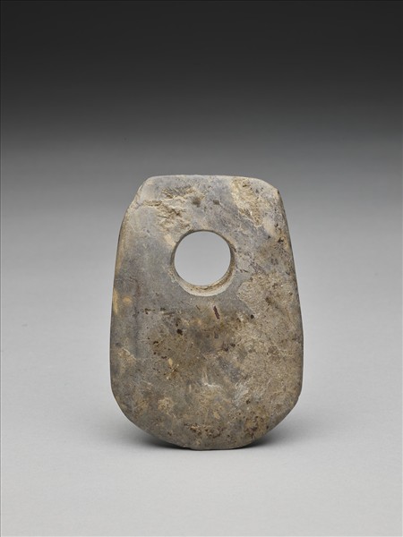 暗紫紅色與淡黃色膠結。近於不對稱橢圓形,小型,器體中略厚實,表面拋磨光滑;平頂,頂緣磨飾整齊,尚留二處較大的崩傷;器兩側微鼓而斜下;圓弧刃,中鋒(雙面刃),無刃線,刃緣厚鈍,有一些小傷;一孔略大,兩面對鑽,鑽心偏離,孔壁旋紋不是很清楚,中間有一交會凸稜。