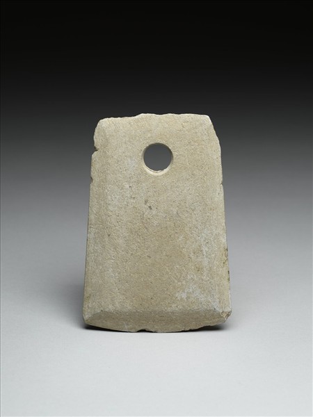 白色泛灰,有整齊的層層紋理。對稱梯形,中型,器體中略厚,表面拋磨平整;平頂,頂緣保留製作崩傷狀,略微磨整;器兩側斜出;平刃略弧,中鋒(雙面刃),刃兩端斜上有模糊的刃稜,刃緣尚稱銳利,有一些小傷;一孔,兩面對鑽,孔壁旋紋清楚,中間有一交會凸稜。