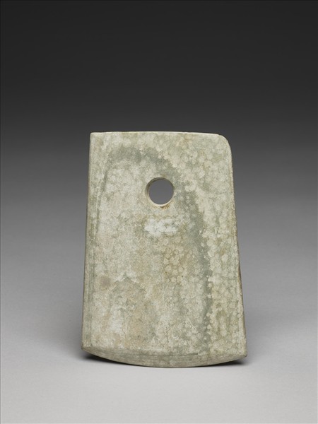 白色泛綠,有明顯的層層紋理。稍不對稱梯形,中型,器體扁平,表面拋磨光滑;平頂,頂緣磨飾整齊,尚留一處較明顯的崩傷;器兩側斜出;平刃略弧,中鋒(雙面刃),刃線不是很清楚,刃緣銳利;一孔略小,兩面對鑽,孔壁旋紋細而不清楚,中間有一交會凸稜。