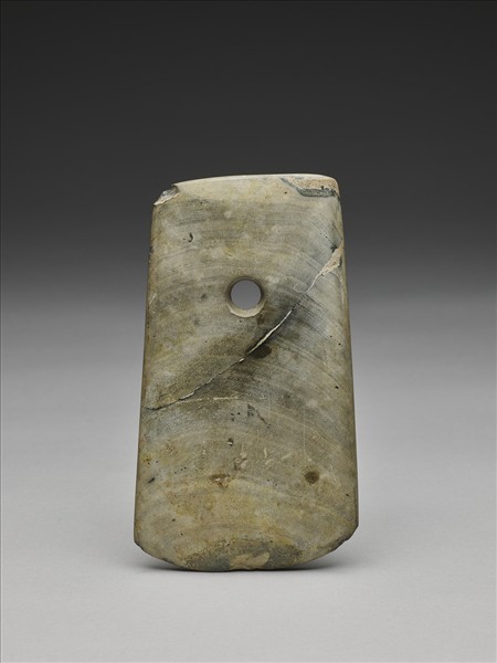 深淺不一灰色,條狀紋理。不對稱梯形,中型,器體中厚實,表面拋磨光滑;平頂,頂緣磨飾整齊,頂一角崩傷;器兩側斜出;不對稱弧刃,中鋒(雙面刃),刃線模糊,有一些小崩傷;一孔略小,兩面對鑽,孔壁旋紋細而不清楚,中間有一交會凸稜。