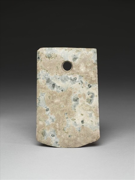 褐紅、灰綠雜斑。幾近長方形,中型,器體扁厚,表面拋磨光滑;斜頂,頂緣磨飾整齊,尚留一些製作崩傷;器兩側垂直下;弧刃,中鋒(雙面刃),刃部厚鈍,刃線模糊,刃緣有一些細傷;一孔略小,兩面對鑽,孔壁旋紋細而不清楚,中間有一交會凸稜。