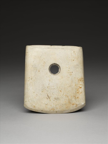 灰白色。近於方形,中型,器體扁厚,表面拋磨光滑;平頂,頂緣磨飾整齊,尚留一些小傷;器兩側直下;弧刃,中鋒(雙面刃),刃部厚鈍,刃線清楚,刃幾近完整無缺傷;一孔,兩面對鑽,孔壁旋紋細而不甚清楚,中間有一淺的交會凸稜。