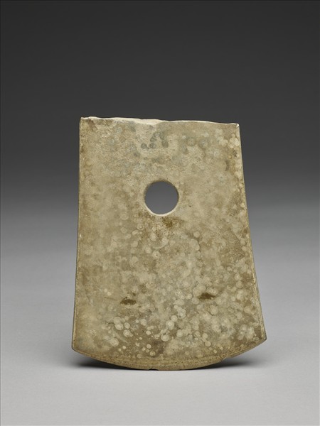 灰褐色。近於扇面形,中型,器體扁平,表面拋磨平整;斜頂,頂緣略磨飾,不甚整齊;器兩側斜出;圓弧刃,中鋒(雙面刃),刃線模糊,刃緣有一些小傷;一孔略大,兩面對鑽,孔壁旋紋較模糊,中間有一交會凸脊。