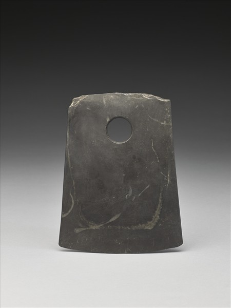 深鐵灰色。對稱梯形,中型,器體扁平,表面拋磨光滑;平頂,頂緣不甚整齊,一端角殘缺;器兩側斜出;弧刃,中鋒(雙面刃),無刃線,刃緣有一些小傷;一孔,兩面對鑽,孔壁旋紋清楚,中間有一交會凸稜。