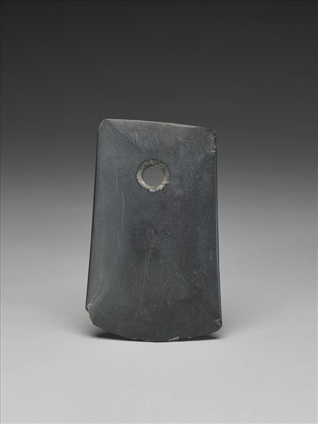 鐵灰色。不對稱梯形,中型,器體中厚實,表面拋磨光滑;平頂略斜,頂緣整齊,尚有一些傷缺;器兩側不對稱斜出;弧刃,中鋒(雙面刃),無刃線,刃緣有一些小傷;一孔,兩面對琢,孔壁旋紋模糊,中間有一交會凸脊。