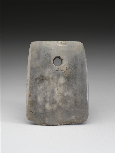 灰色。對稱梯形,中型,表面光滑,器體鼓厚,器體一面有白斑;平頂,頂緣修磨整齊,背部尚留一些製作時的崩傷。平刃略弧,中鋒(雙面刃),無刃線,刃緣多處使用崩傷。一孔,兩面對鑽,中間有鑽交凸稜,此凸稜極細微,壁面近於垂直而幾乎見不到旋紋。