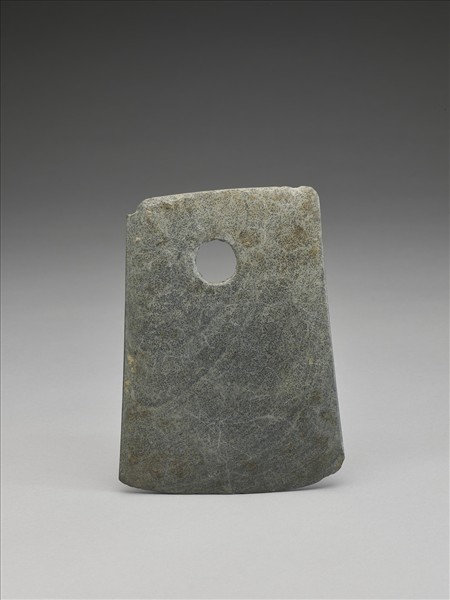灰色,散佈較密的芝麻斑點,紋理清楚。對稱梯形,中型,器形工整,表面拋磨光滑,器體中間微厚;平頂略斜,一端作一小矩形肩,(單肩)頂緣修磨過,尚留小崩傷;刃帶弧,刃一端有較明顯的崩傷,其餘多處小傷(皆屬舊傷)。一孔略大,兩面對鑽,一面似乎以琢的方式鑽通的,孔壁一半整齊一半不整齊,鑽交凸稜亦較模糊。