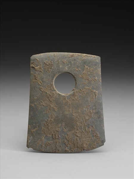 均勻的白色細沙點的灰色,表面似乎經風化,並沾附泥。稍不對稱梯形,中型,器體中間略鼓,完整,表面拋磨光滑;平頂微斜弧,頂緣修磨過;弧刃微不對稱,中鋒(雙面刃),刃緣完整有二處崩傷,此二處崩傷似不屬於使用傷,其餘部分無傷;一孔略大,兩面對琢,孔壁帶凸弧平滑,中間有交會凸脊。