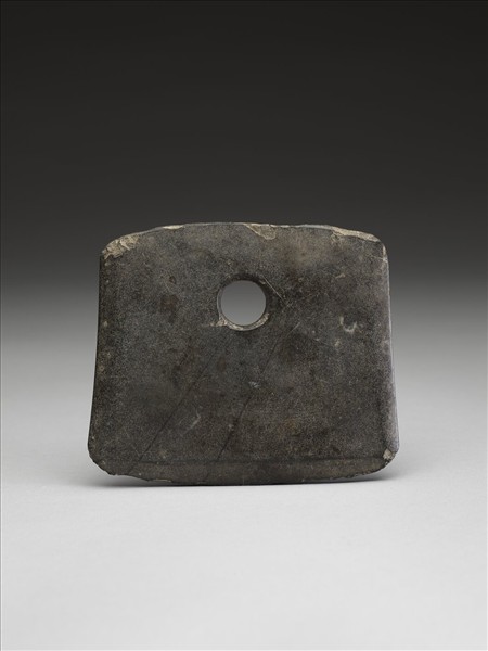 細的白點暗灰色,表面風化較輕微。器體平整,三邊斜薄有界稜,表面拋磨光滑;平頂略弧,頂緣經簡單修磨過,仍留有一些崩傷;平刃,刃兩端弧,刃緣多處崩傷,均屬小傷;一孔,兩面對琢,孔壁磨飾過,中間有交會凸脊。