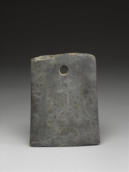 灰色,表面風化較輕微,有風化白絲網紋。對稱梯形,中型,器體中微厚實,表面拋磨光滑;頂略斜,不整齊,保留製作時的崩狀;器兩側微斜出;平刃,刃線不清楚,刃緣有兩處較明顯的崩傷,其餘無傷;一孔略小,兩面對鑽,孔壁旋紋清楚,中間一交會凸稜。