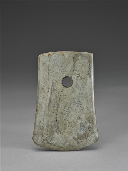 細粒有明顯的層理,雜細粒斑灰綠色,表面風化稍重。對稱梯形,中型,器體中厚實,表面拋磨光滑;平頂略弧,頂緣磨飾整齊,僅留一些製作時的崩傷;器兩側撇出如「鳳」字形;弧刃,無刃線,刃稍厚鈍,刃緣有多處崩傷;一孔略小,兩面對鑽,孔壁旋紋細而不清楚。
