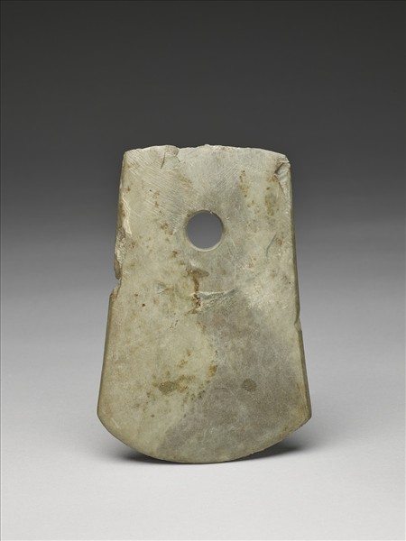雜細粒斑灰綠色,表面風化輕微。對稱梯形,中型,器體中厚實,表面拋磨光滑;平頂略弧,頂緣保留製作時的崩傷狀況;器兩側撇出如「鳳」字形,一側有一處較明顯的崩傷;弧刃,無刃線,刃稍厚鈍,刃緣有較密集的小傷,屬使用傷;一孔略小,單面鑽,孔壁旋紋細而清楚。