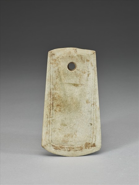 白色泛綠,有整齊的層層紋理成框邊。對稱梯形,小型,器體中略厚實,表面拋磨光滑;弧頂,頂緣磨飾整齊,尚留一些較小的崩傷;器兩側斜出;弧刃,中鋒(雙面刃),刃兩端斜上有模糊的刃稜,刃緣銳利,有一些細傷;一孔甚小,單面鑽,孔壁旋紋清楚,孔底修飾過。
