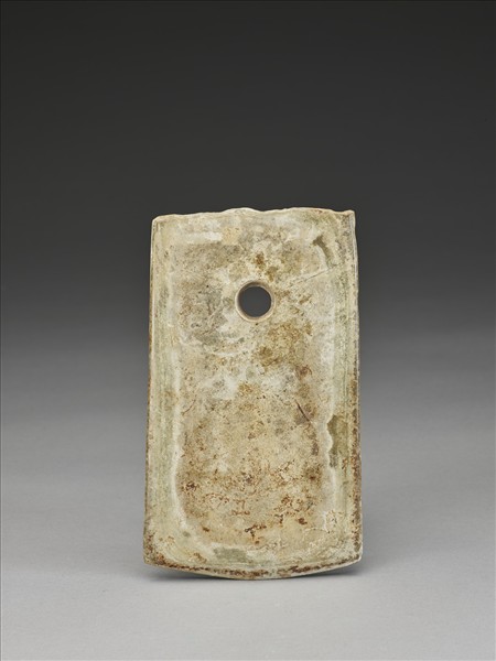 白色斑灰,有整齊的層層紋理。幾近長方形,中型,器體扁平,表面拋磨光滑;平頂,頂緣保留製作崩傷狀;器兩側幾近垂直而下;平刃略弧,中鋒(雙面刃),刃線模糊,刃部鈍厚,刃緣銳利,有一些細傷;一孔較小,兩面對鑽,孔壁旋紋細而清楚,中間有一交會凸稜。