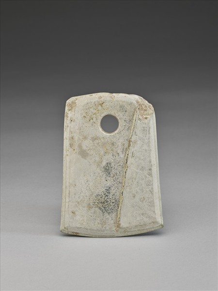 白色泛灰,有整齊的層層紋理。稍不對稱梯形,小型,器體扁平,表面拋磨光滑;弧頂,頂緣磨飾過,尚留一些較小的崩傷;器兩側斜出;平刃略弧,中鋒(雙面刃),刃線尚稱清楚,刃緣銳利;一孔,兩面對鑽,孔壁旋紋尚稱清楚,中間有一交會凸稜。
