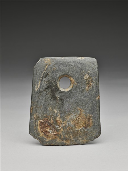 細的白點暗灰色,表面風化較輕微。對稱梯形,小型,器體中間略鼓,四邊均斜薄,表面拋磨光滑,一面有兩處較嚴重的腐蝕;平頂微弧,頂緣經修磨過,仍留有一些崩傷;弧刃,中鋒(雙面刃),刃緣崩傷嚴重,兩端崩損較大;一孔,兩面對琢,孔壁不整齊而粗糙,中間有一交會凸脊。