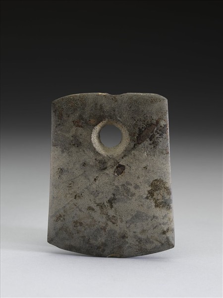 較深的灰褐色帶附著物斑。對稱梯形,中型,器稍小,器體中厚實,表面拋磨光滑,器面附著一些雜質與器面一起風化;平頂略弧,頂緣磨飾整齊,一處較明顯的崩傷;器兩側直下略斜;弧刃,無刃線,刃稍厚鈍,刃緣有一處小崩傷(非使用傷);一孔,兩面對琢,孔壁中間有一交會凸脊。