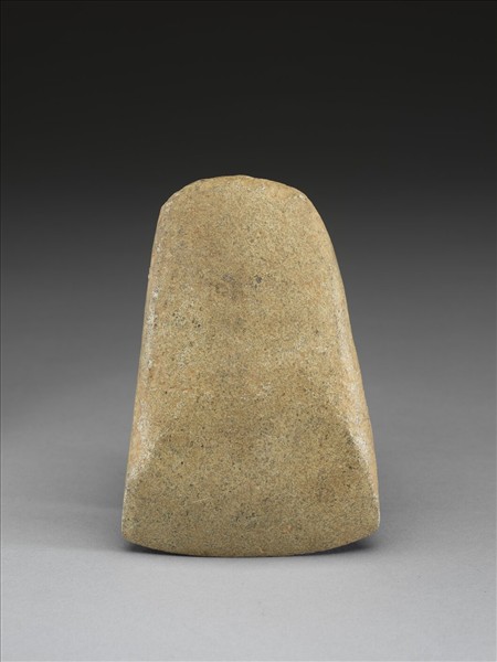 土黃色。對稱梯形,中型,器體厚實,表面拋磨尚稱光滑;弧頂,頂緣不整齊;器兩側對稱斜出;弧刃,中鋒(雙面刃),無刃線,刃緣有一些小傷。