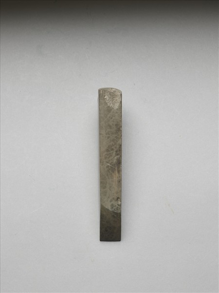 絲網紋斑,細直線條紋,青灰色。對稱梯形,小型,器體呈錐狀形,四邊切割整齊,背面平整,有一處打剝痕,正面微鼓,無段,器兩側平整,全器器表拋磨光滑;平刃,偏鋒,刃緣有小傷。