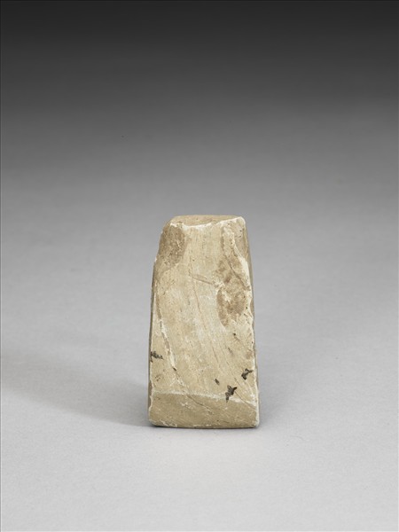 紋理清楚,灰褐色。對稱梯形,小型,器體扁平,四邊切割尚稱整齊,背面平整微鼓,有三處較明顯的表面崩傷,正面平整微鼓,亦有一些淺傷,無段,器體表面拋磨光滑;器頂兩端角皆有崩殘;平刃,偏鋒,刃緣有小傷。