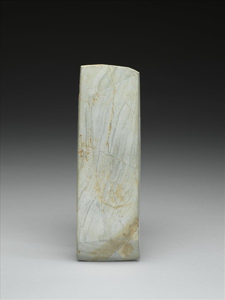 紋理清楚,青灰色。近於長方形,中型,器體略寬扁平,四邊切割整齊,背面平整,有大片表面傷,正面微鼓,無段,器兩側平整,一側略帶打剝痕,器的頂端表面不平整,全器拋磨光滑;平刃略斜,偏鋒,刃緣有細傷。