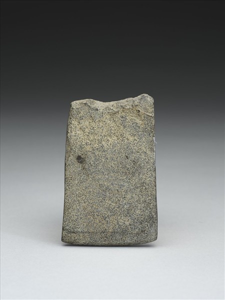 細斑點,灰色。對稱梯形,小型,器體略寬扁平,四邊切割整齊,背面平整,正面平整,無段,器兩側平整,一側略帶打剝痕,器頂端不整齊,保留打剝痕,全器器表拋磨光滑;平刃微弧,偏鋒,刃緣幾近無傷。