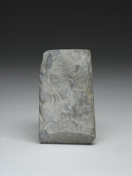 絲網紋斑,細直線條紋,青灰色。對稱梯形,小型,器體扁平,四邊切割整齊,背面平整,有多處表面傷,正面微鼓,無段,有多處小打剝痕,尤其是頂緣的部分傷痕較多,器一側平整,另一側不平整,全器器表拋磨光滑;平刃略斜,偏鋒,刃緣一端角崩殘,其餘屬小傷。