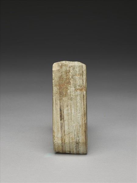 條紋,深淺不一褐灰色。對稱梯形,中型,器體厚實,四邊切割整齊,背面平整,有一些打剝痕,正面微鼓,無段,近刃部有一處較明顯的表面崩剝傷,器兩側平整,惟留一些打剝痕,全器器表拋磨光滑;平刃略斜,偏鋒,刃緣有一些小傷。
