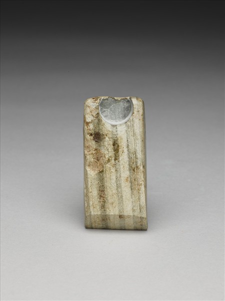 條紋,深淺不一褐灰色。對稱梯形,小型,器體厚實,四邊切割整齊,背面平整,有一些打剝痕,正面微鼓,無段,器兩側平整,全器器表拋磨光滑;平刃略斜,偏鋒,刃緣有一些細傷。